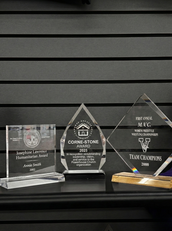 - Engraved Plaques: High-quality wood, acrylic, and glass plaques for corporate recognition, employee of the month, or athletic milestones.